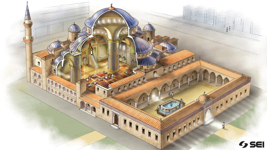 Le moschee, di forma rettangolare, hanno caratteristiche comuni in tutto il mondo. I fedeli si dispongono in linee orizzontali sul lato lungo della moschea, in direzione della Mecca ed eseguono la preghiera secondo 3 posizioni predefinite: in piedi, in ginocchio, e genuflessi toccando con il capo la terra. Nella fase iniziale il predicatore ripete la 1^ sura (Fatiha) 5 volte, per 5 volte al giorno.